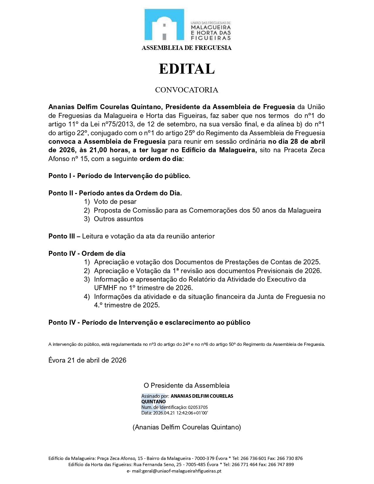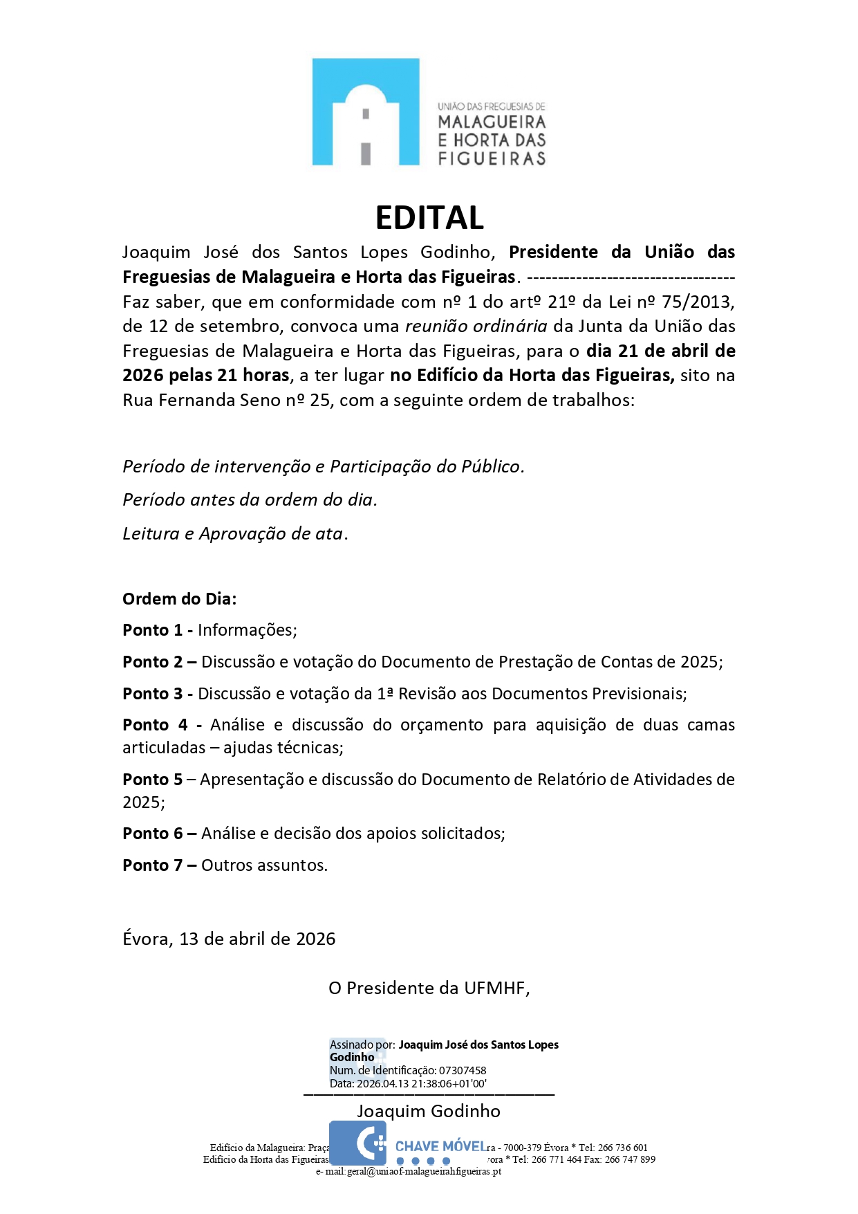 © 2026 União das Freguesias de Malagueira e Horta das Figueiras. Todos os direitos reservados | Termos e Condições