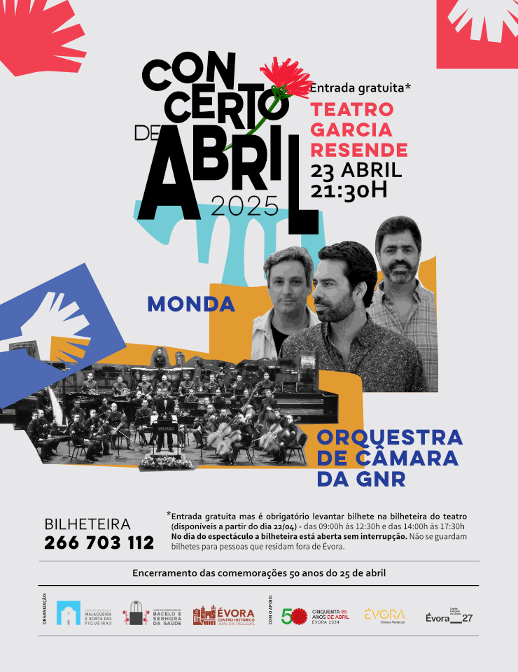 No âmbito das comemorações dos 50 anos do 25 de Abril, as Juntas de Freguesia da Malagueira e Horta das Figueiras, Bacelo e Senhora da Saúde, e Centro Histórico de Évora promovem o Concerto de Abril 2025, a realizar-se no dia 23 de abril, pelas 21h30, no Teatro Garcia de Resende.