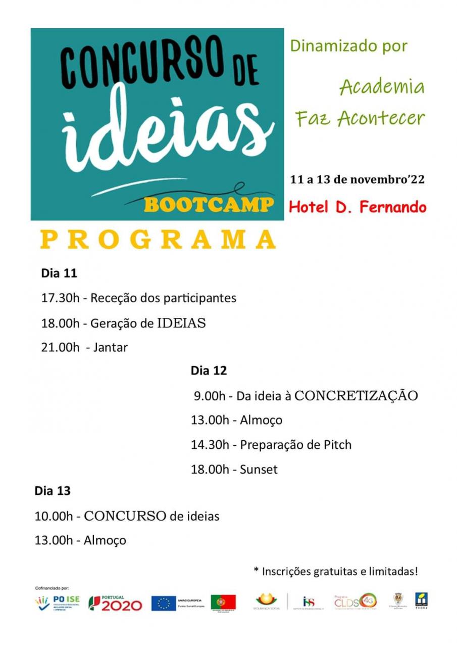 Nos próximos dias 11, 12 e 13 de novembro, o projeto Vidas Ativas 4G em parceria com a Academia Faz Acontecer vai realizar um Bootcamp - Concurso de Ideias no Hotel D. Fernando, em Évora.