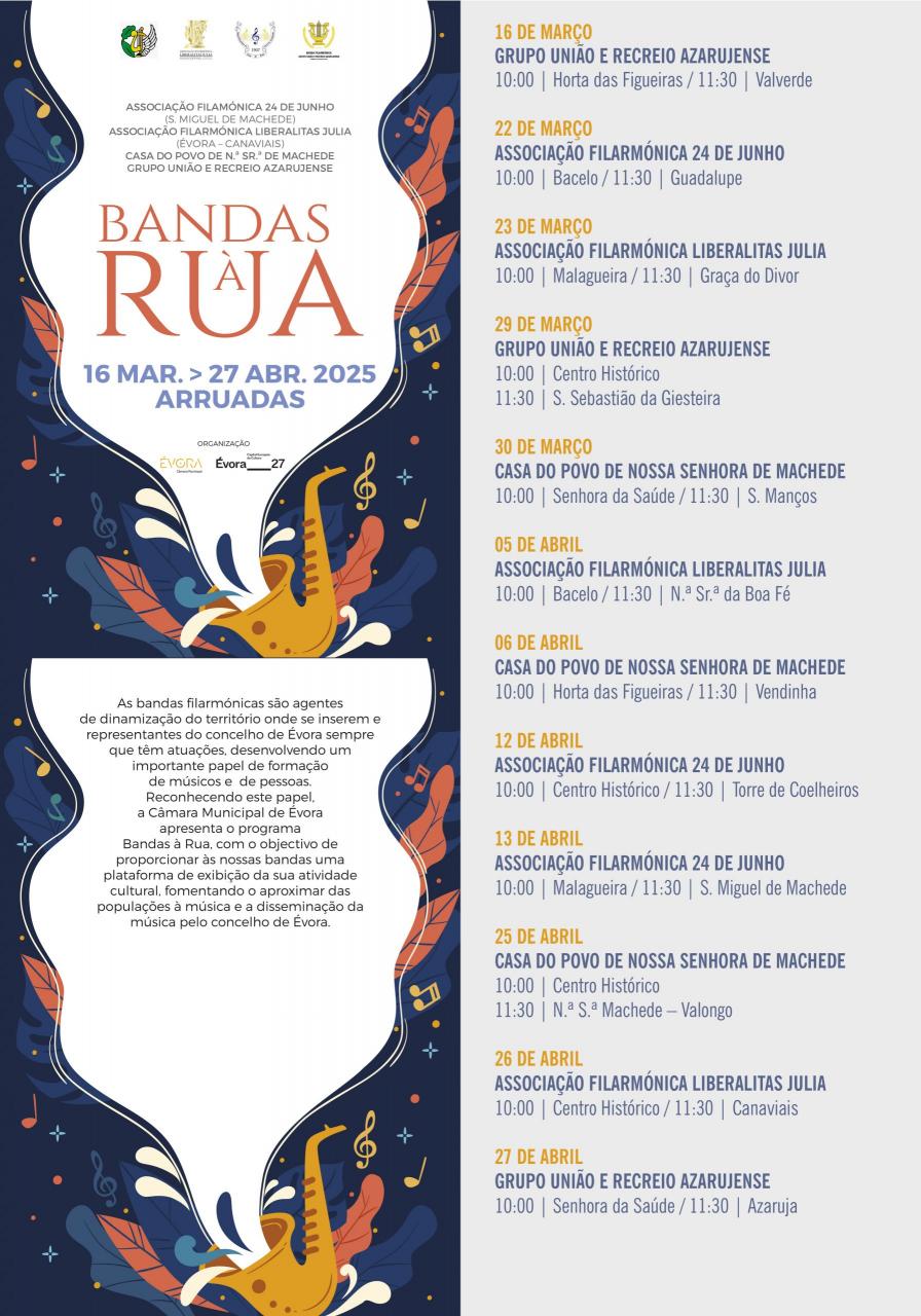 A música filarmónica vai ecoar por todo o concelho de Évora com o programa Bandas à Rua. De março a abril, diferentes bandas irão atuar nas ruas e praças da cidade e freguesias, levando a tradição e a emoção da música ao encontro das comunidades.